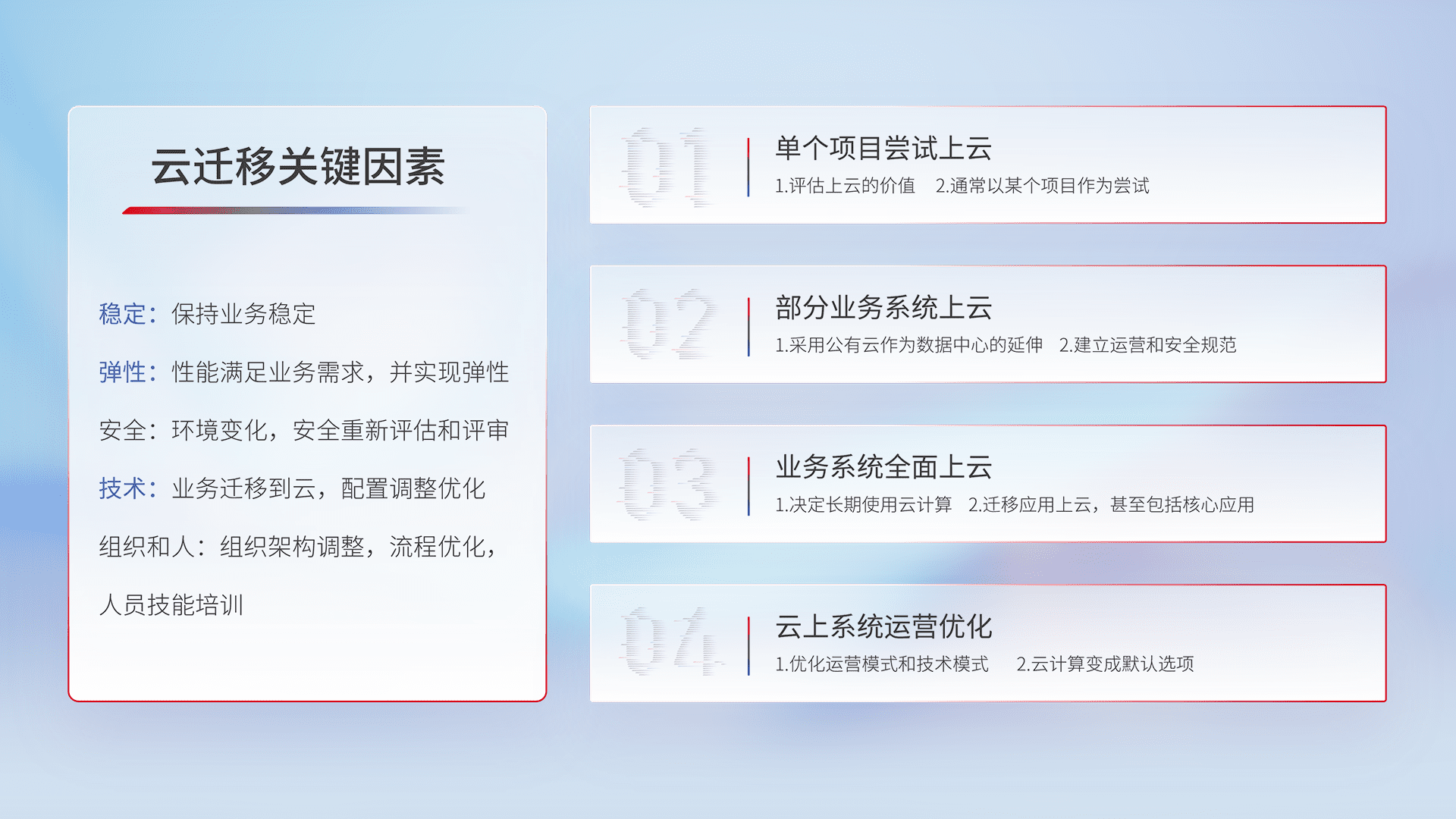 结合实际业务,,,从规划设计、、、云平台选型、、、云原生改造、、、数据迁移、、、、集成交付,,,,迁移全过程为客户识别最佳上云路径,,,,做好风险识别管理,,,设计网络架构、、身份权限、、、、安全审计合规、、、操作审计、、、、日志审计、、、、监控告警策略、、、、多站点容灾设计等,,对云上基础设施进行整体规划,,,,提升IT治理水平,,,,以满足弹性、、高可用、、、高性能的需求。。。