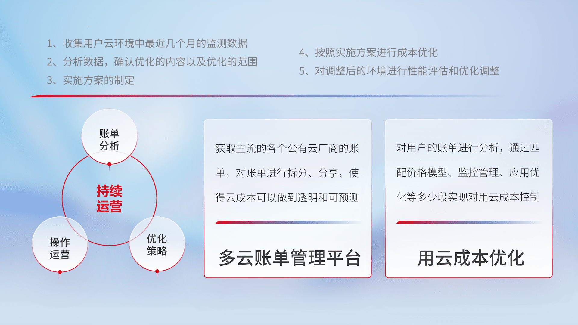 通过多云纳管,,以统一的资源数据模型把客户的云资源进行抽象和封装,,,进而实现对多云资源的统一操作,,,,保障云资源管理的可靠性、、、、稳定性与可用性。。。。量身定制化运维内容,,,,配置、、、、开发运维、、、、补丁管理、、备份、、、监控、、、认证和访问管理、、、审计和日常巡检等,,,,保障在用云过程中的可靠度,,,稳定度以及高可用率。。。。